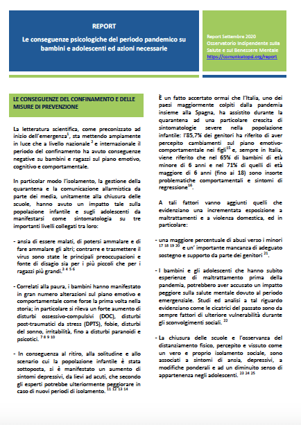 Per i riferimenti scientifici in merito, si veda il report dell’Osservatorio indipendente sulla salute e sul benessere mentale “Le conseguenze psicologiche del periodo pandemico su bambini e adolescenti ed azioni necessarie“.
