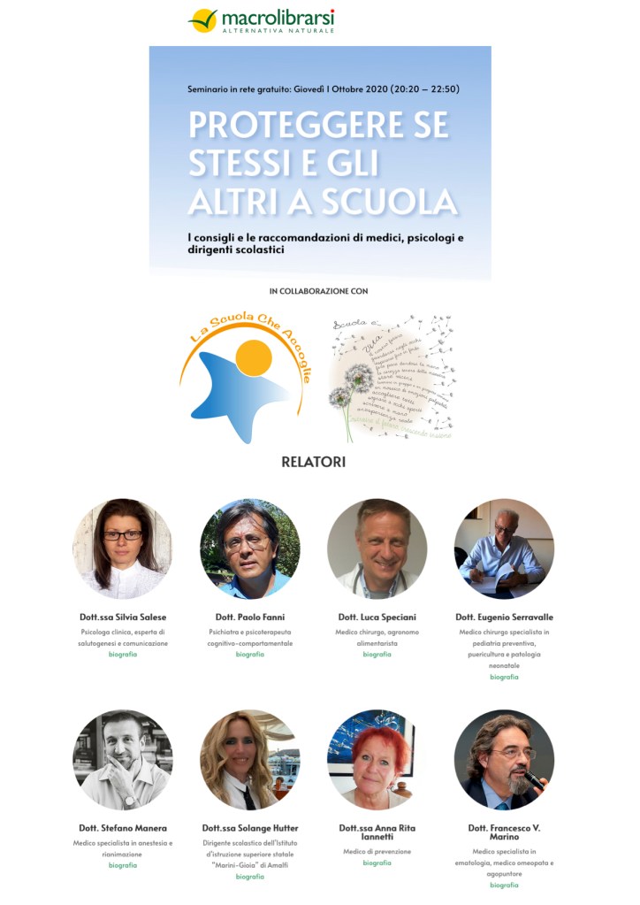 Sono davvero lieta di invitare tutti all’incontro webinar che si terrà domani sera, Giovedì 1 Ottobre, dedicato al ritorno a scuola. I relatori si annoverano tra i principali professionisti e promotori della salute in Italia. Io e Paolo Fanni, che insieme a Luca Bertolotti abbiamo scritto e divulgato il Comunicato di allarme di psicologi e psichiatri, parleremo della salute psichica e di come promuoverla e rafforzarla negli studenti, forti della ricerca degli ultimi mesi e dell’esperienza diretta sul campo.